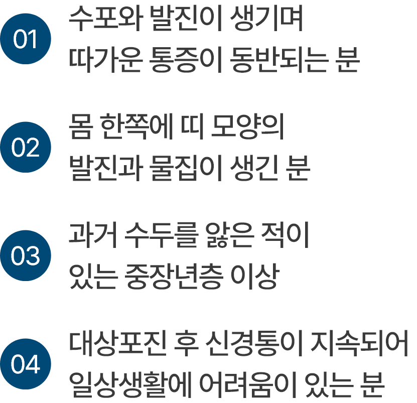 통증을 한번 더 관리하는 맞춤치료로 빠르게 대상포진에서 벗어날 수 있게 해 드립니다.